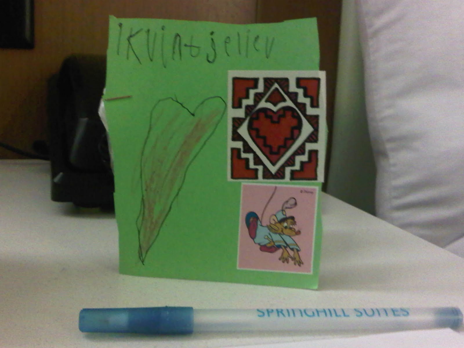 Terwijl ik mijn koffer uitpakte in het hotel, rolde er 2 kaarten uit mijn bagage. 1 hele lieve kaart van Sabina en een hele lieve kaart van Jill. Helemaal geweldig! let vooral op de spelling van Jill's kaart.